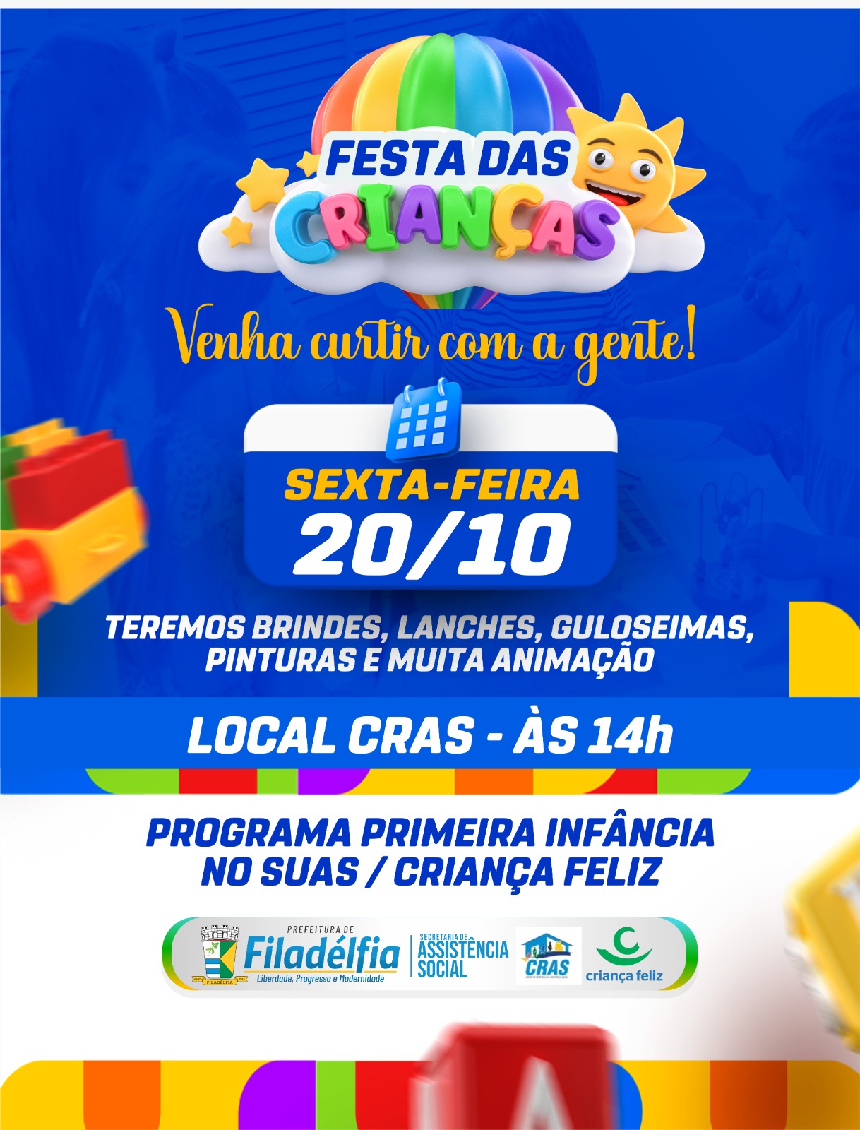 As comemorações do mês das Crianças ainda estão acontecendo em Filadélfia, a Prefeitura através da Secretaria Municipal de Assistência Social, realizará nesta sexta-feira, dia 20, a Festa das Crianças, para criançada que faz parte do programa Primeira Infância no Suas - Criança Feliz.