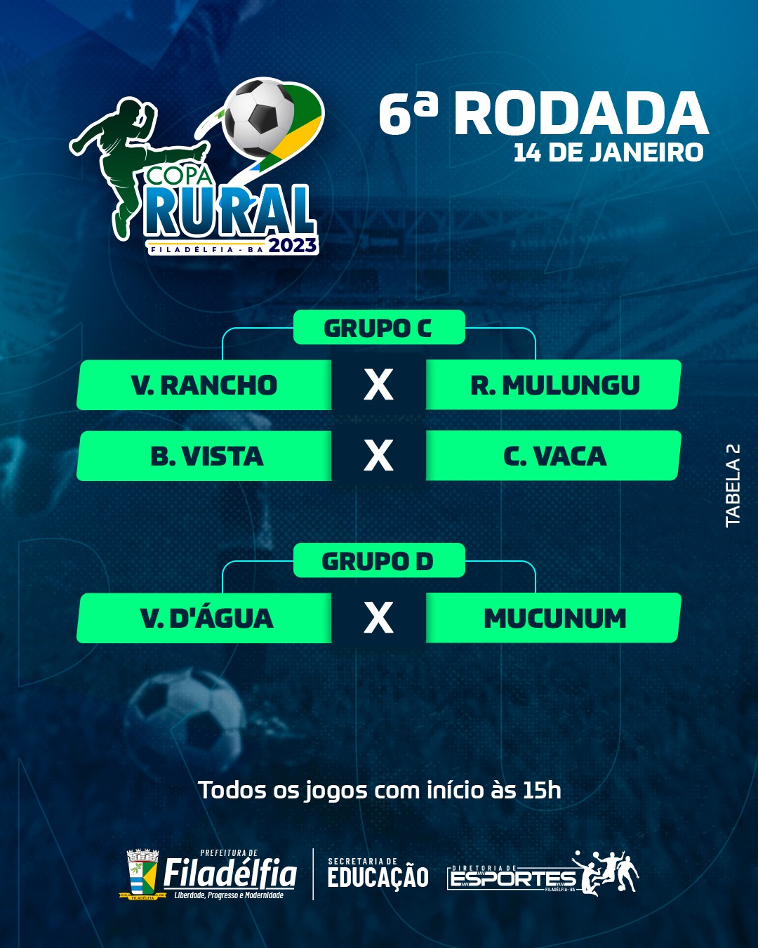 A Prefeitura de Filadélfia, por meio da Secretaria Municipal de Educação e Desporto - Semed e Diretoria de Esportes, realizará neste domingo, dia 14 de Janeiro, a 6ª Rodada da Copa Rural 2023/24.