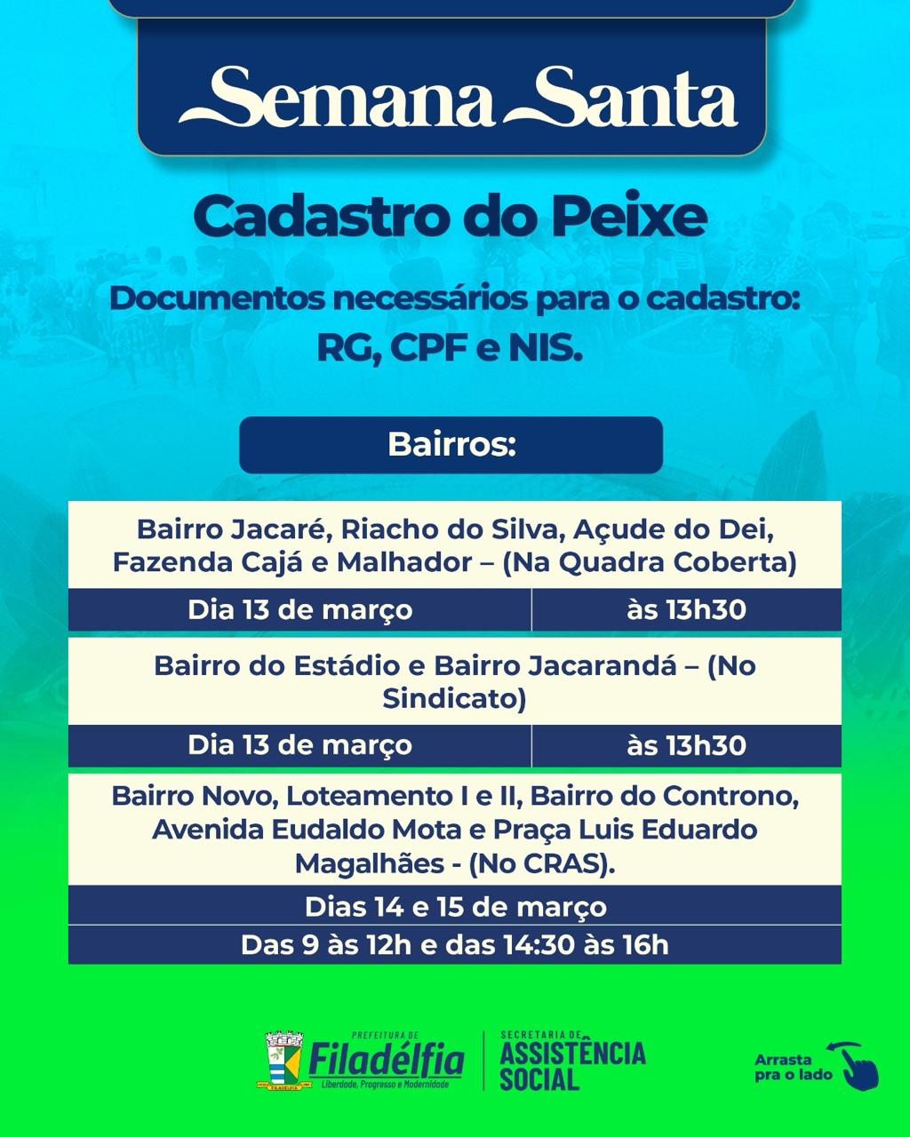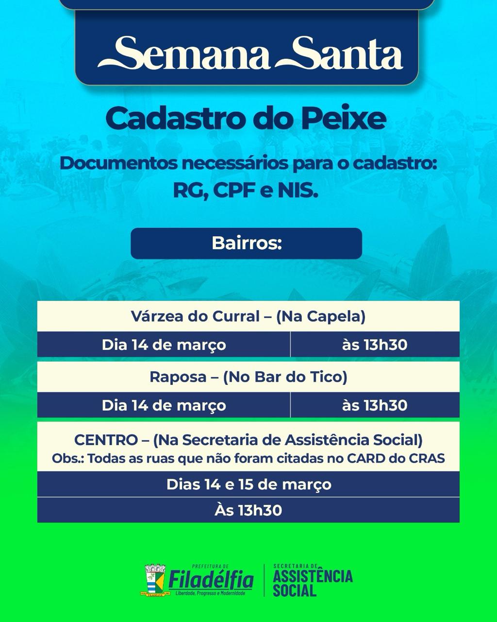 A Prefeitura de Filadélfia, por meio da Secretaria Municipal de Assistência Social, vai dar início nesta quarta-feira, dia 13, ao Cadastro para distribuição do Peixe na Sede do município.