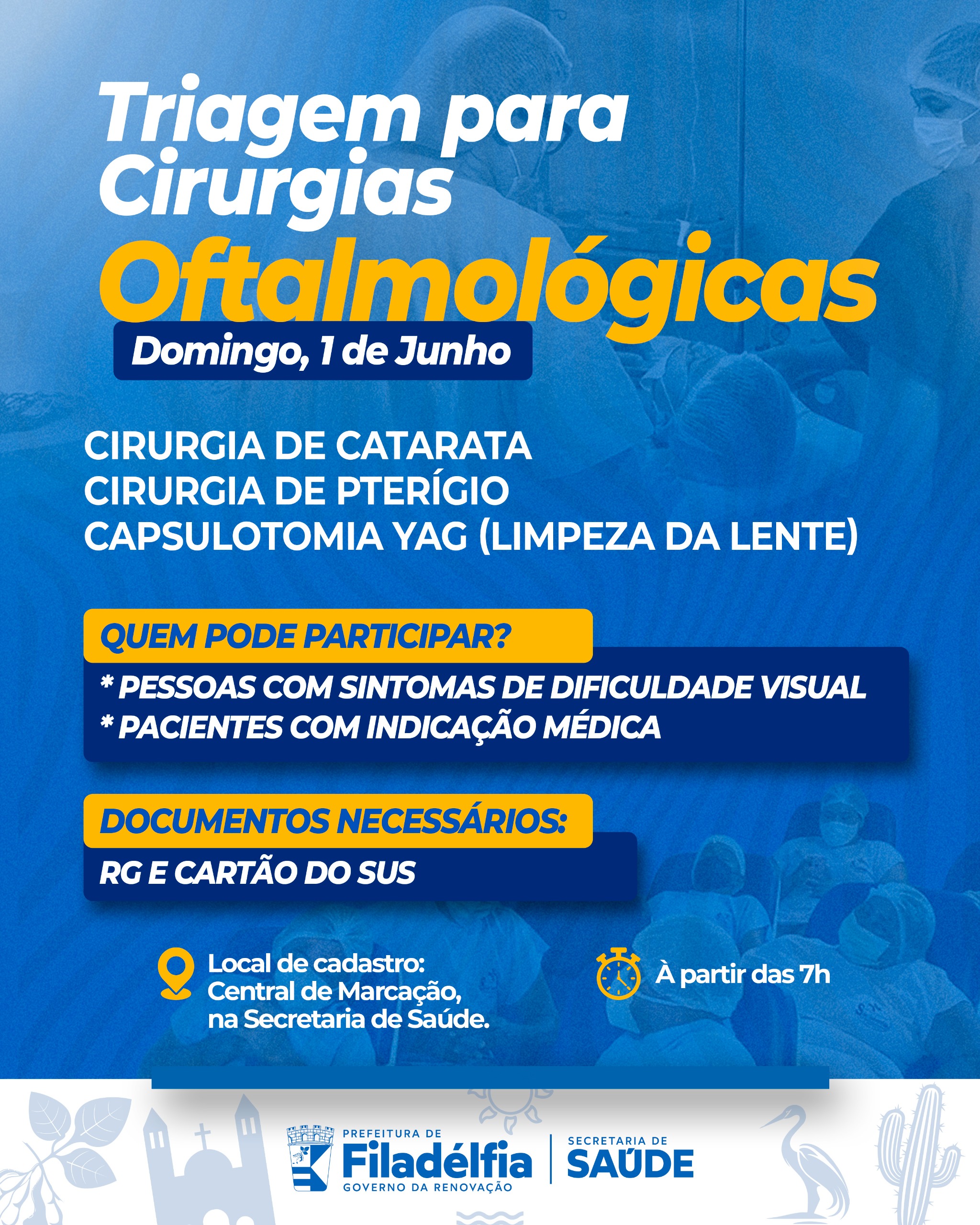 A Prefeitura de Filadélfia, através da Secretaria de Saúde, informa que neste domingo, 1º de junho, a partir das 7h da manhã, realizaremos uma triagem para os procedimentos oftalmológicos: